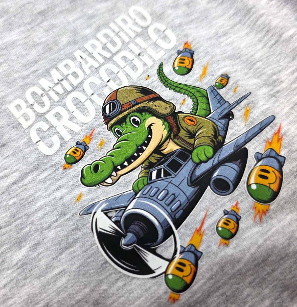 Zabawny Nadruk z Charakterem: Na piersi widnieje starannie wykonana grafika "BOMBARDIRO CROCODILO". Krokodyl w stylu retro-pilota (w goglach i hełmie) lecący myśliwcem to motyw, który przyciąga wzrok i wywołuje uśmiech. Nadruk jest dyskretny (na piersi), co wygląda bardzo stylowo.