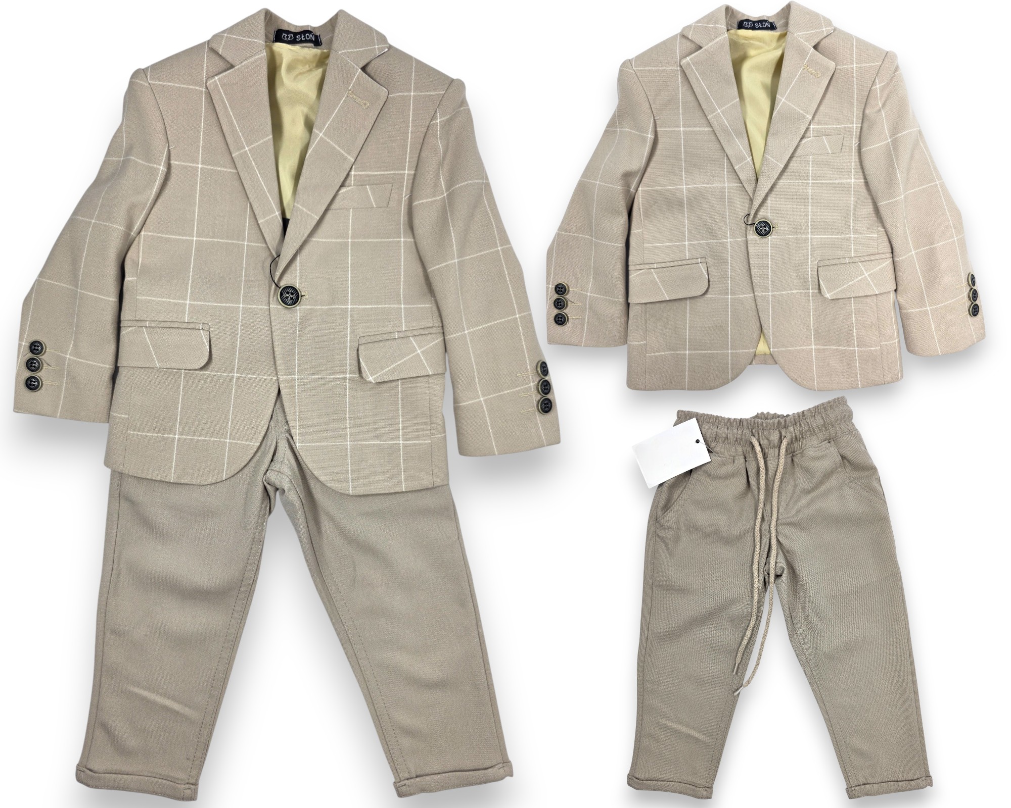 GARNITUR CHŁOPIĘCY beżowa krata marynarka spodnie WIZYTOWY