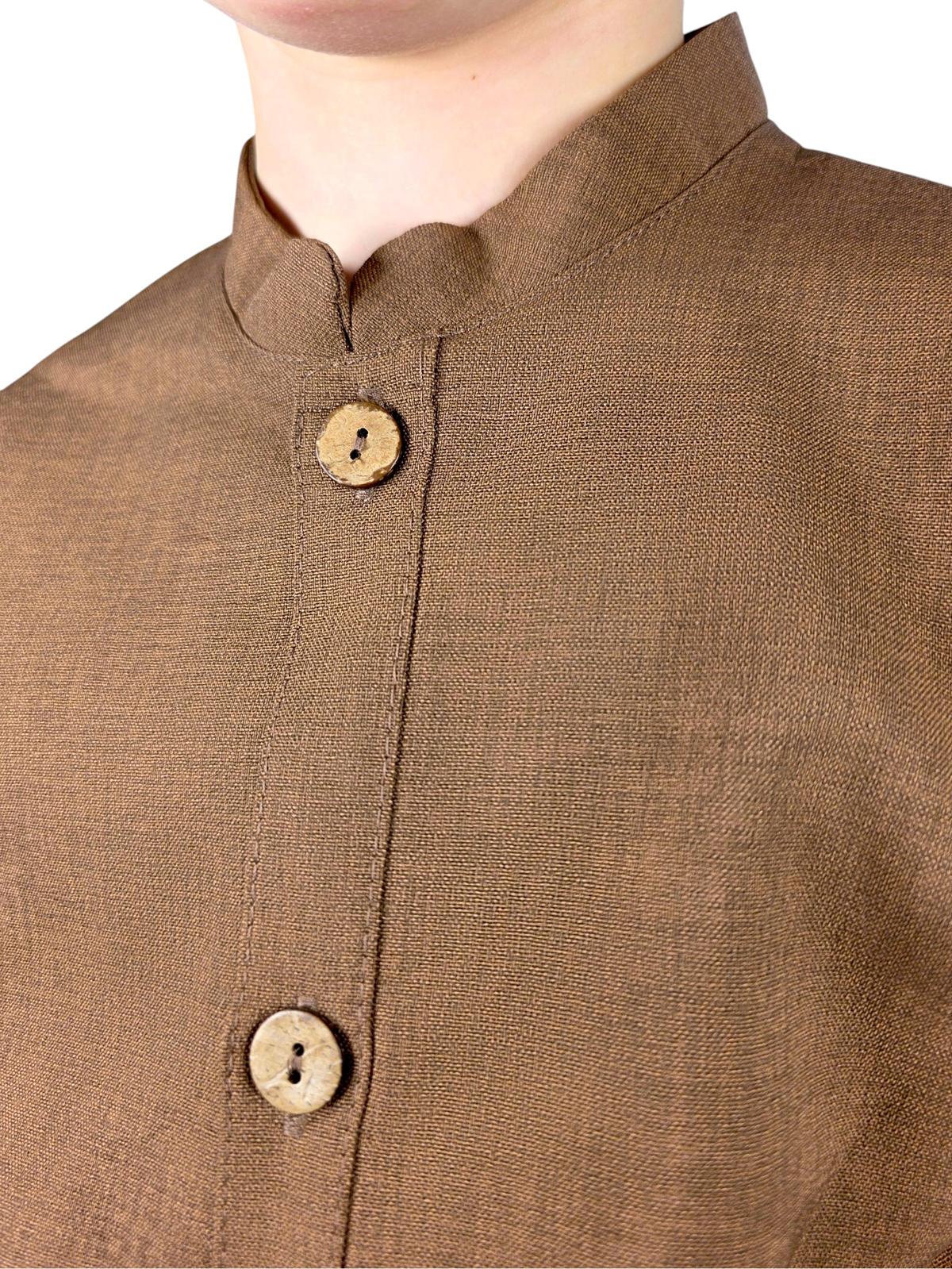 🌿 Styl Rustykalny i Eko: Koszula ma piękny, niejednolity kolor ciemnego brązu (melanż). Choć jest to 100% bawełna, materiał ma fakturę przypominającą len (lniana struktura), co wygląda bardzo szlachetnie. Całość dopełniają drewniane guziki, nadające koszuli rustykalny sznyt.