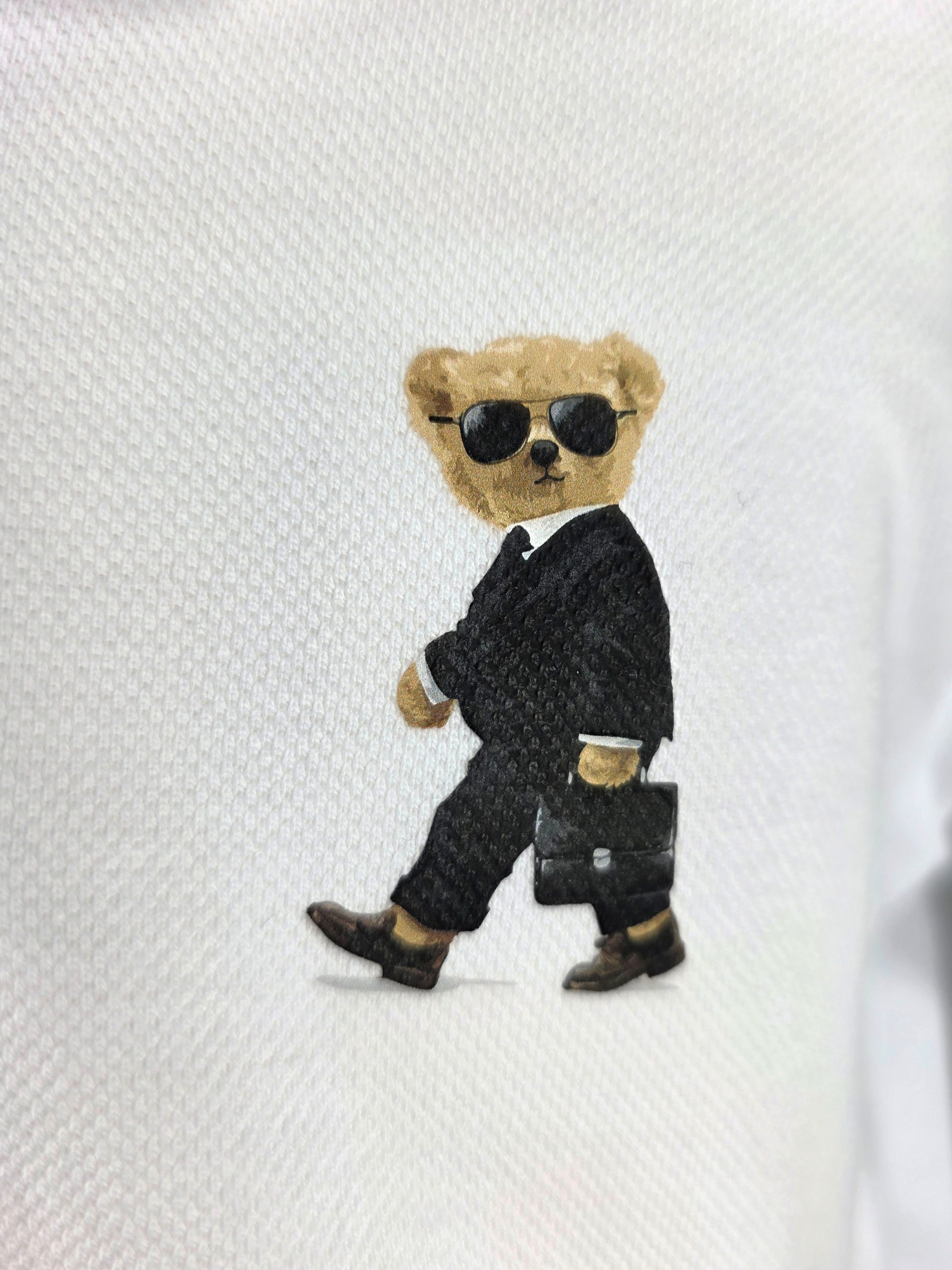 🐻 Miś z Klasą: Na piersi znajduje się precyzyjny haft przedstawiający misia w garniturze, ciemnych okularach i z teczką. Ten "Cool Business Bear" dodaje stylizacji luzu i sprawia, że koszulka jest unikatowa.