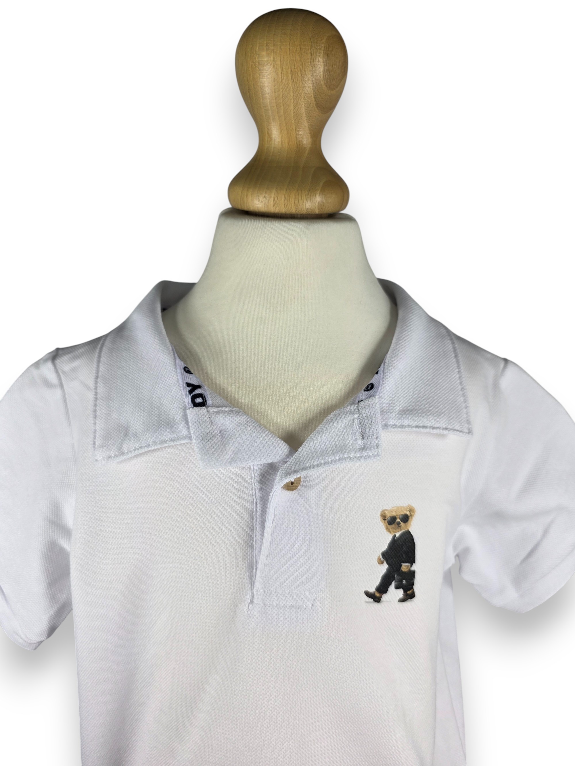 Oto koszulka polo, która robi furorę! Klasyczna biel została przełamana haftem Misia Biznesmena. To idealny wybór na przedszkolne uroczystości, niedzielny obiad u babci czy letni spacer. Twój syn będzie w niej wyglądał schludnie, modnie i z przymrużeniem oka.