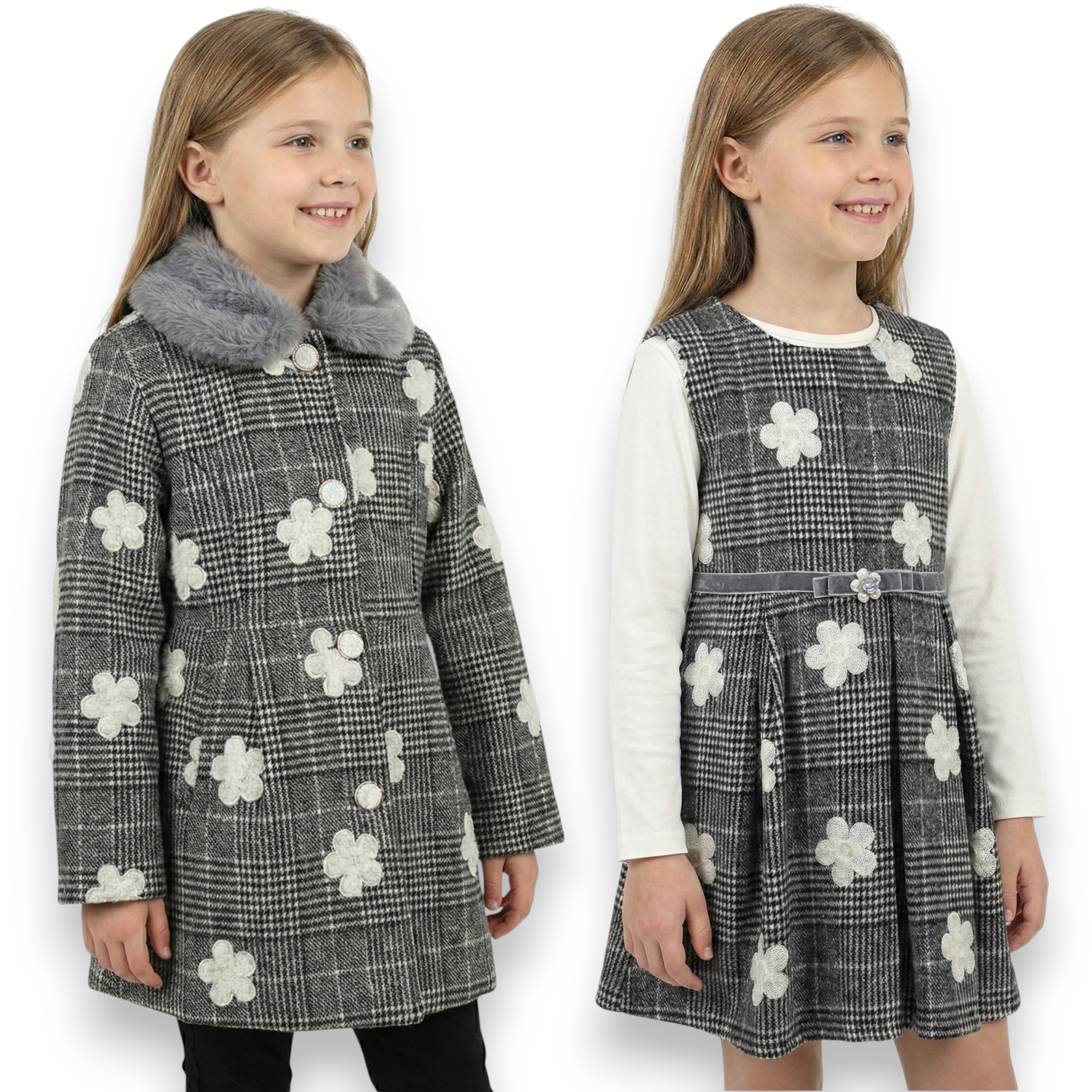 ZIMOWY ZESTAW 3w1 jasny szary płaszcz sukienka bluzka futerko ŚWIĘTA