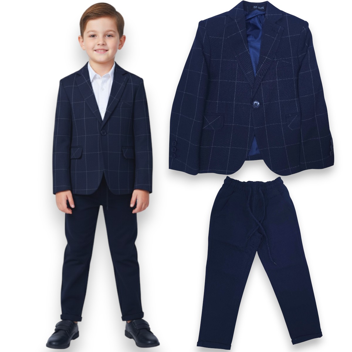 GARNITUR CHŁOPIĘCY granatowa krata marynarka spodnie ELEGANCKI