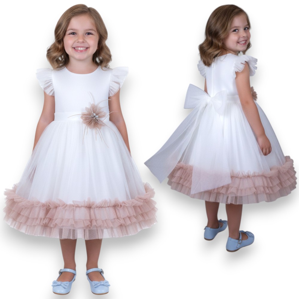 SUKIENKA WIZYTOWA biała tiul BEŻOWY dół kwiat PRODUKT POLSKI