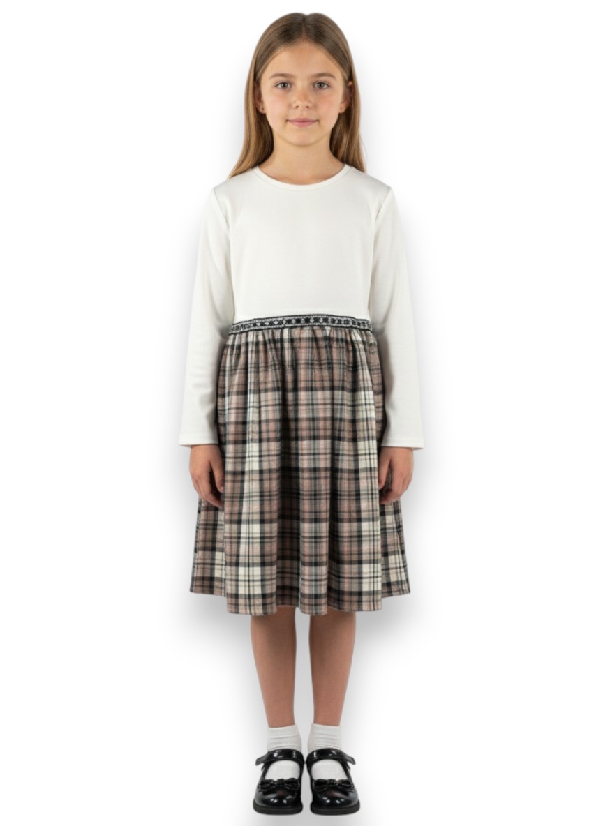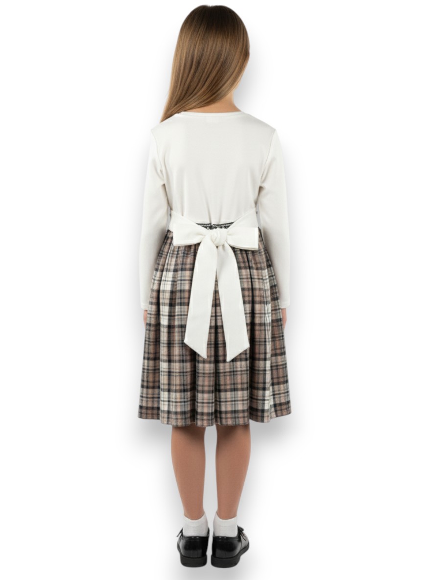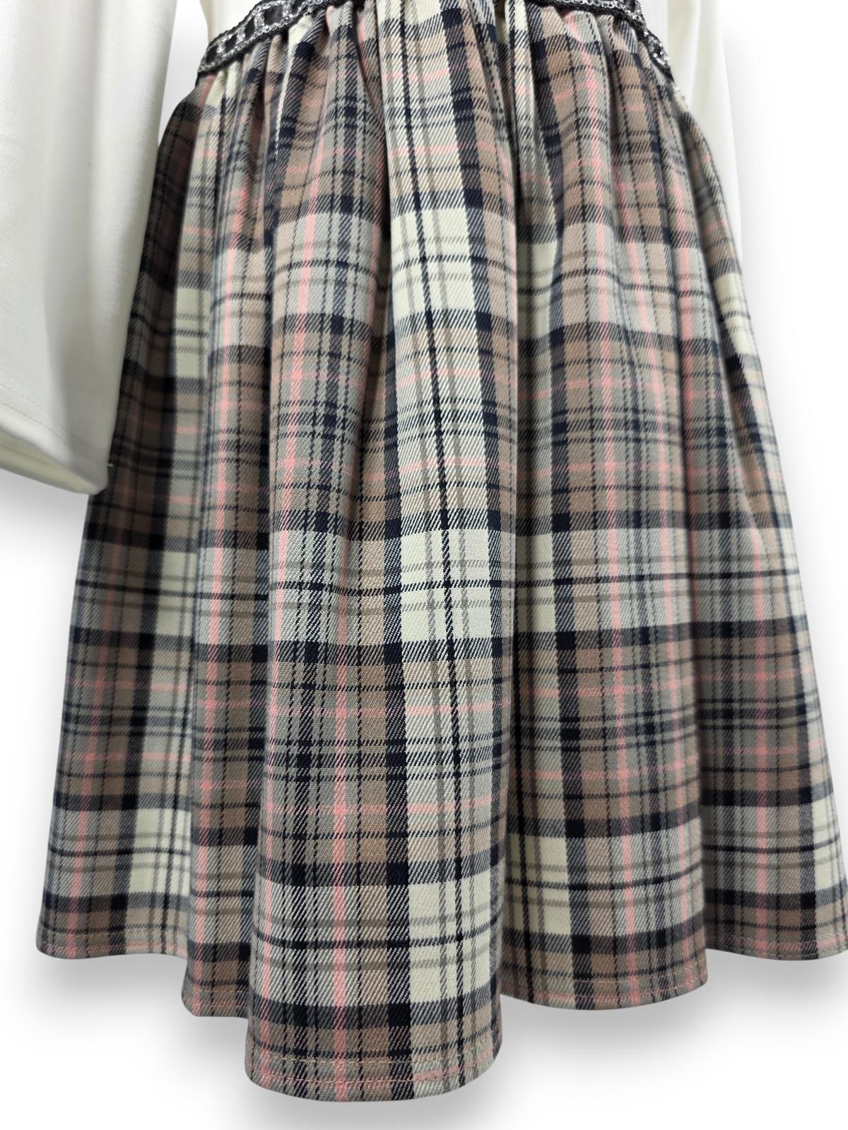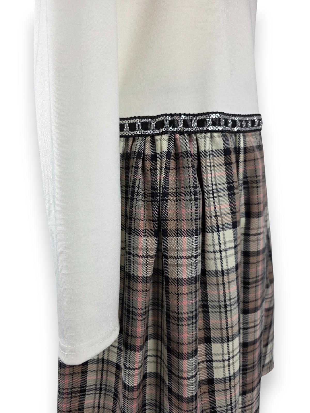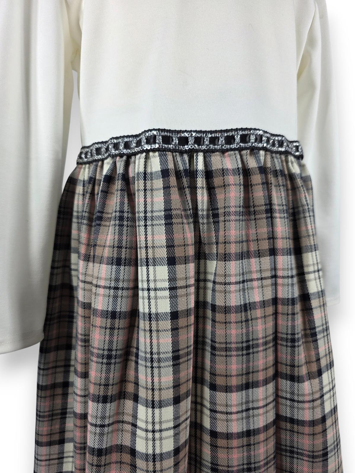 🏁 Modna Krata: Dół sukienki zdobi ponadczasowa krata w odcieniach beżu, różu i czerni. To wzór, który dodaje szyku i idealnie wpisuje się w świąteczny klimat.