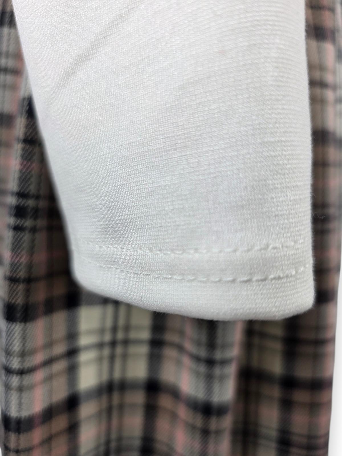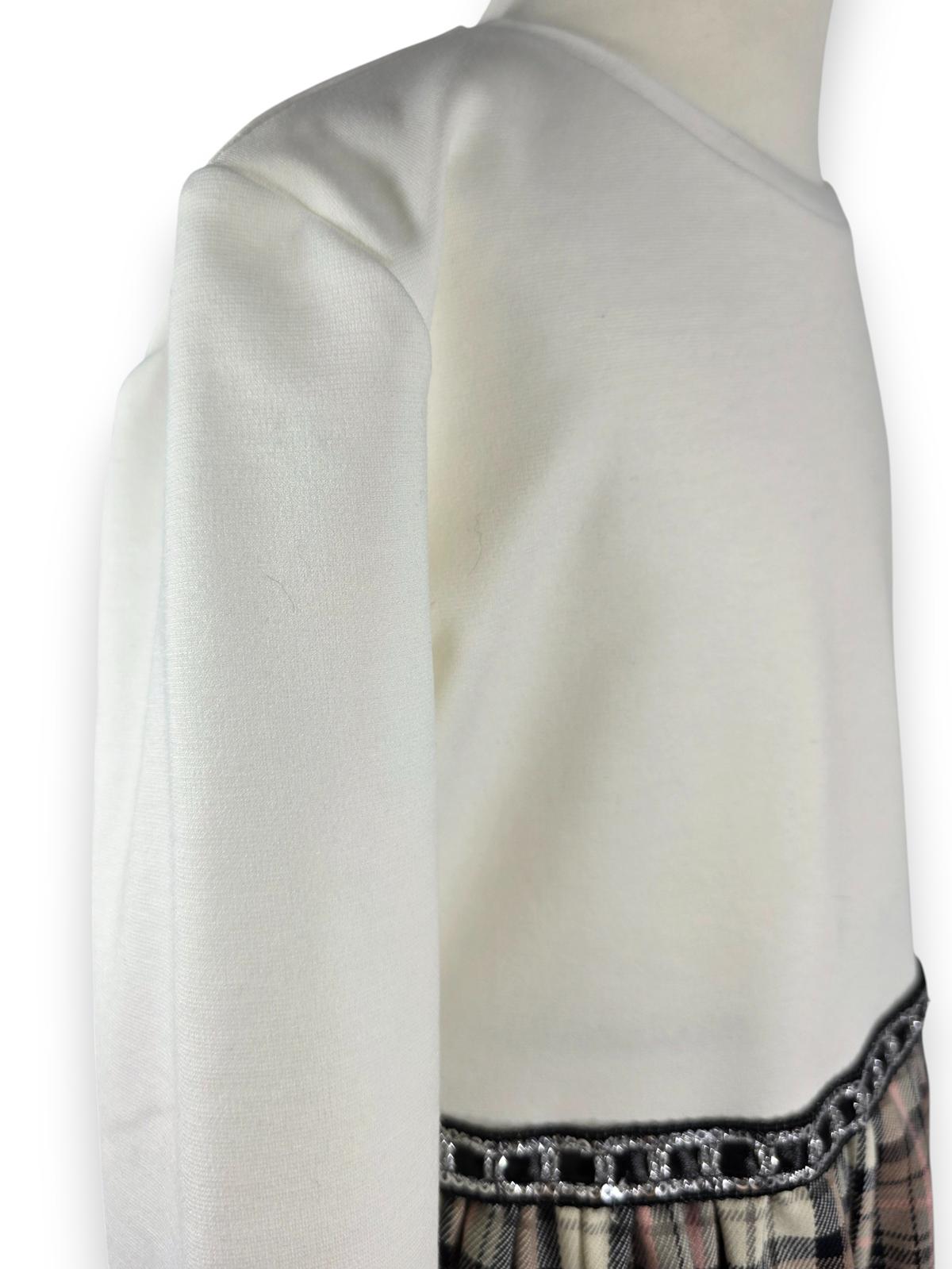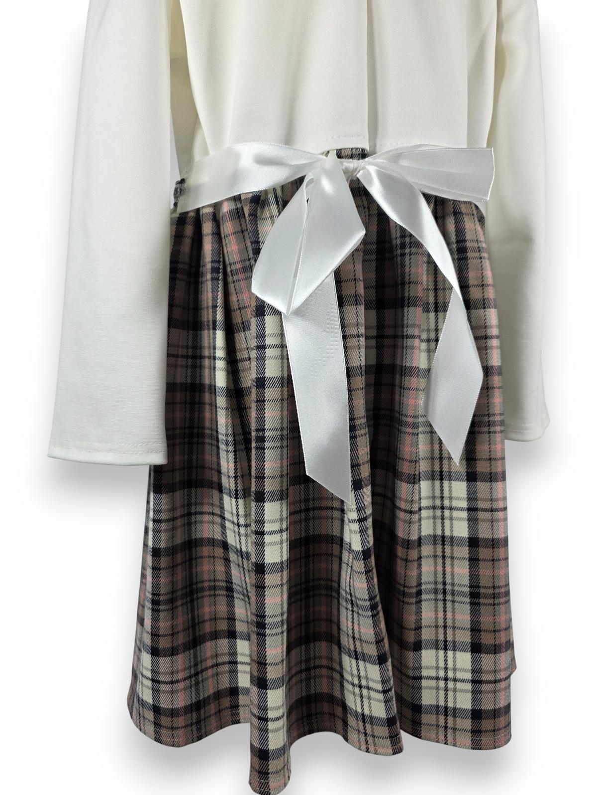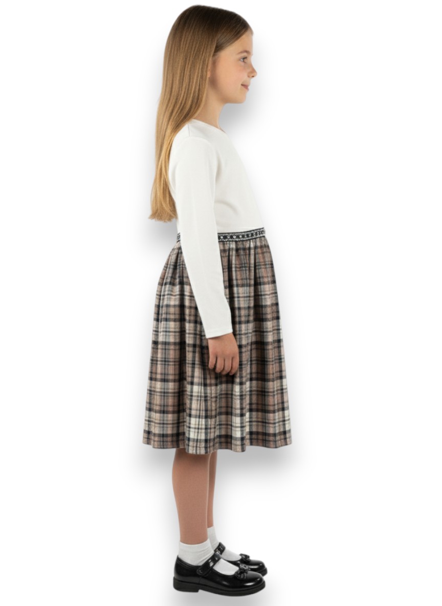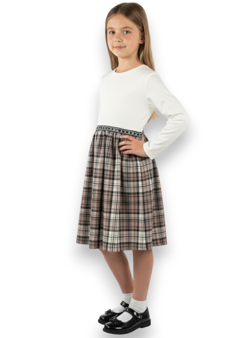 🏁 Modna Krata: Dół sukienki zdobi ponadczasowa krata w odcieniach beżu, różu i czerni. To wzór, który dodaje szyku i idealnie wpisuje się w świąteczny klimat.