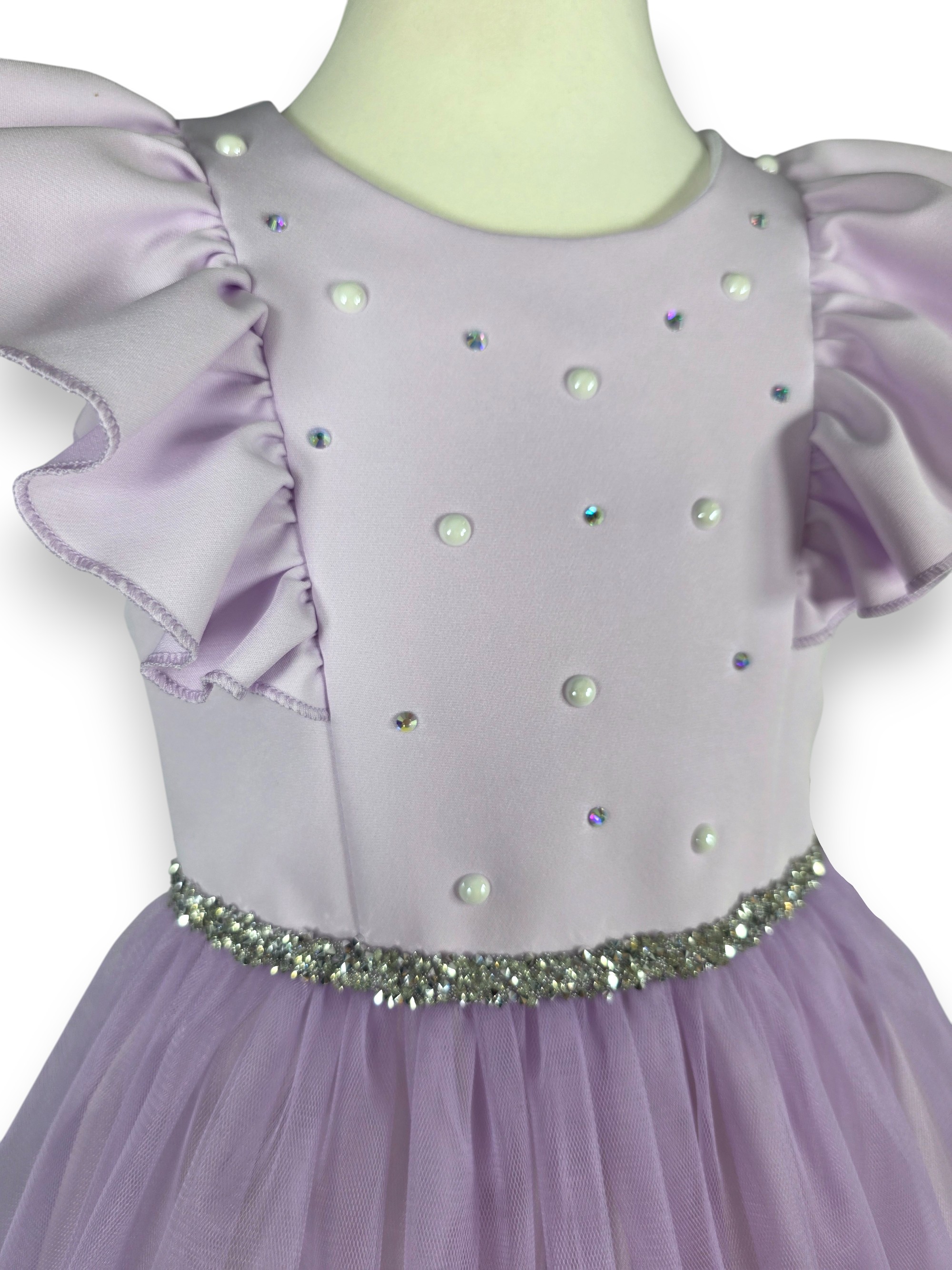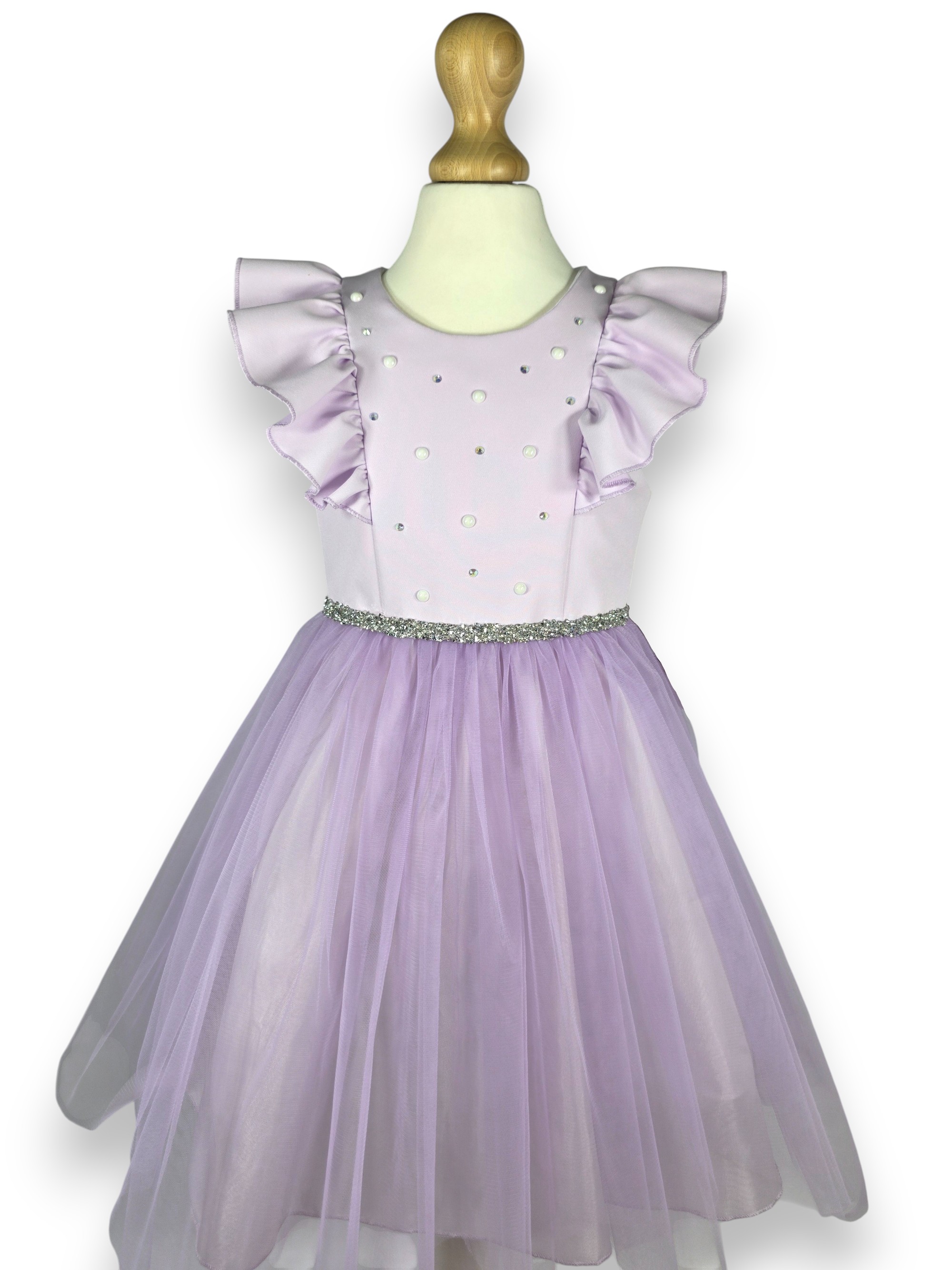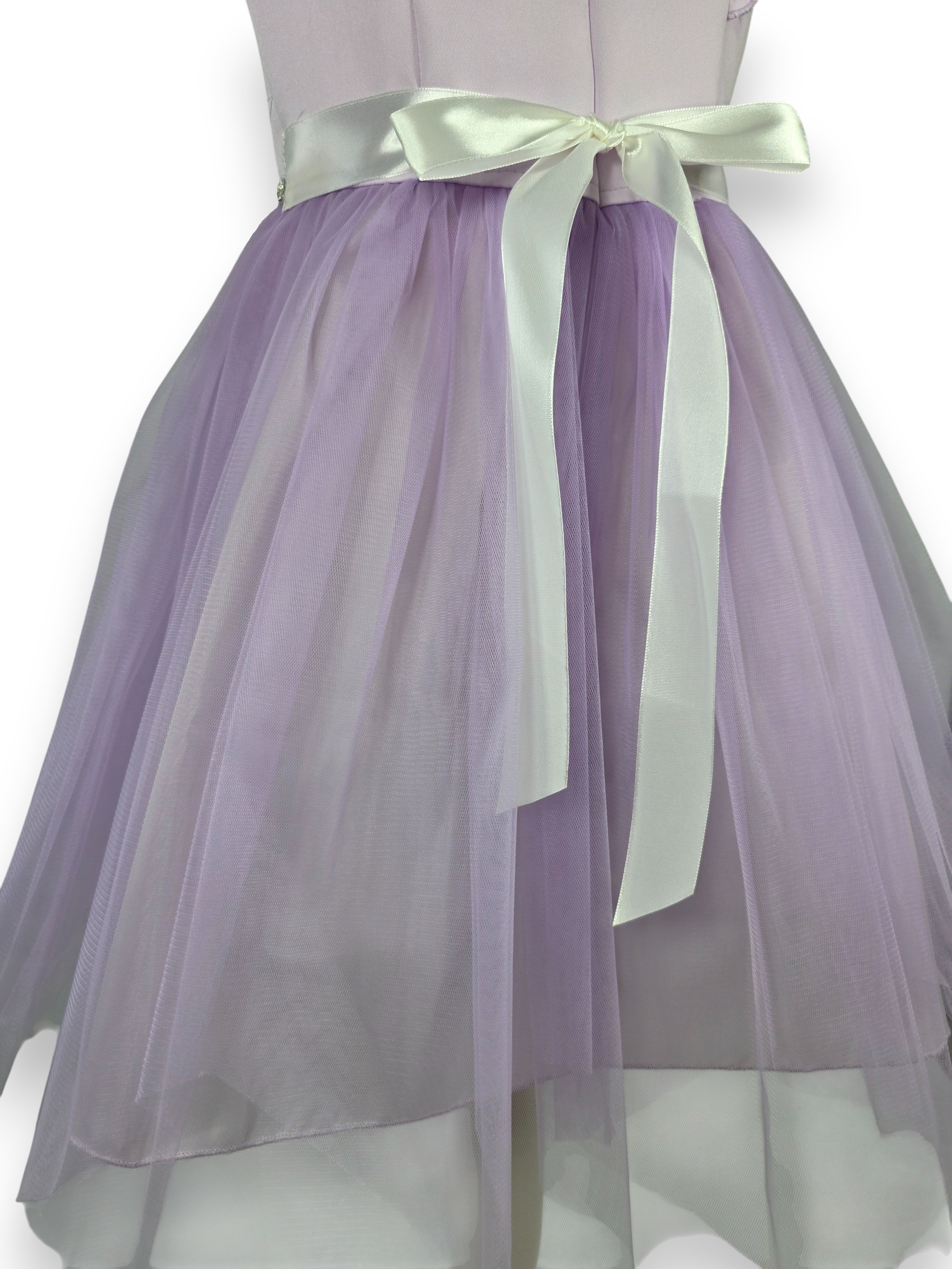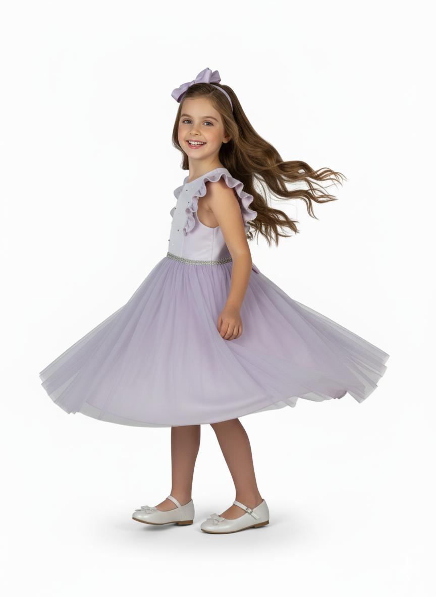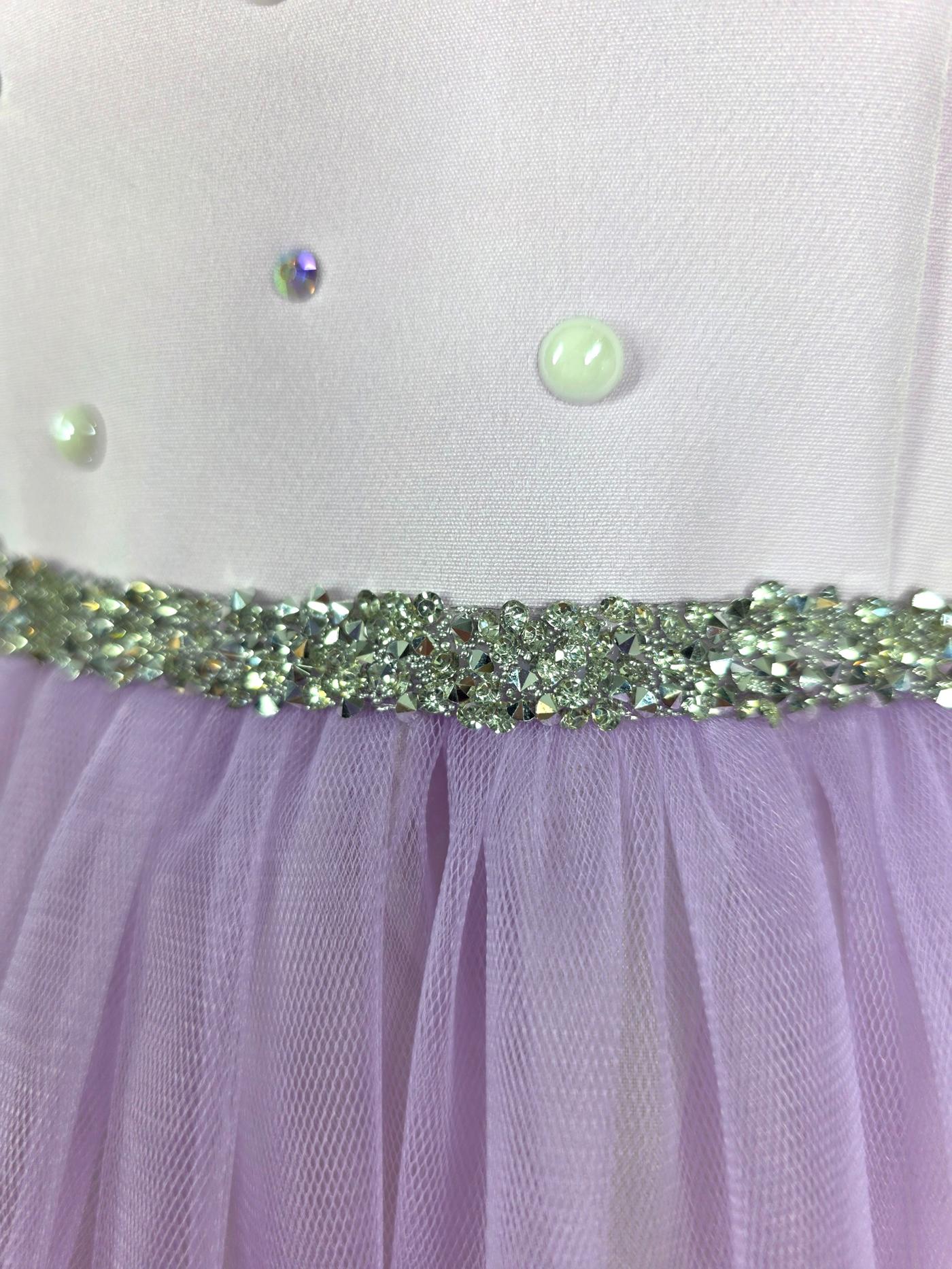 Ta przepiękna sukienka w odcieniu delikatnej lawendy to kwintesencja stylu glamour w dziewczęcym wydaniu. Bogactwo zdobień połączone z lekkością tiulu sprawia, że to idealny wybór na wesele, przyjęcie komunijne, urodziny czy wielki bal.