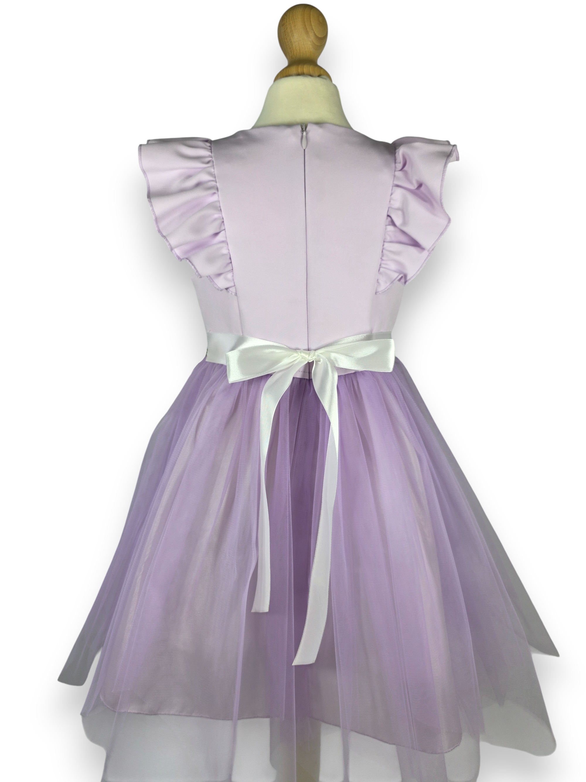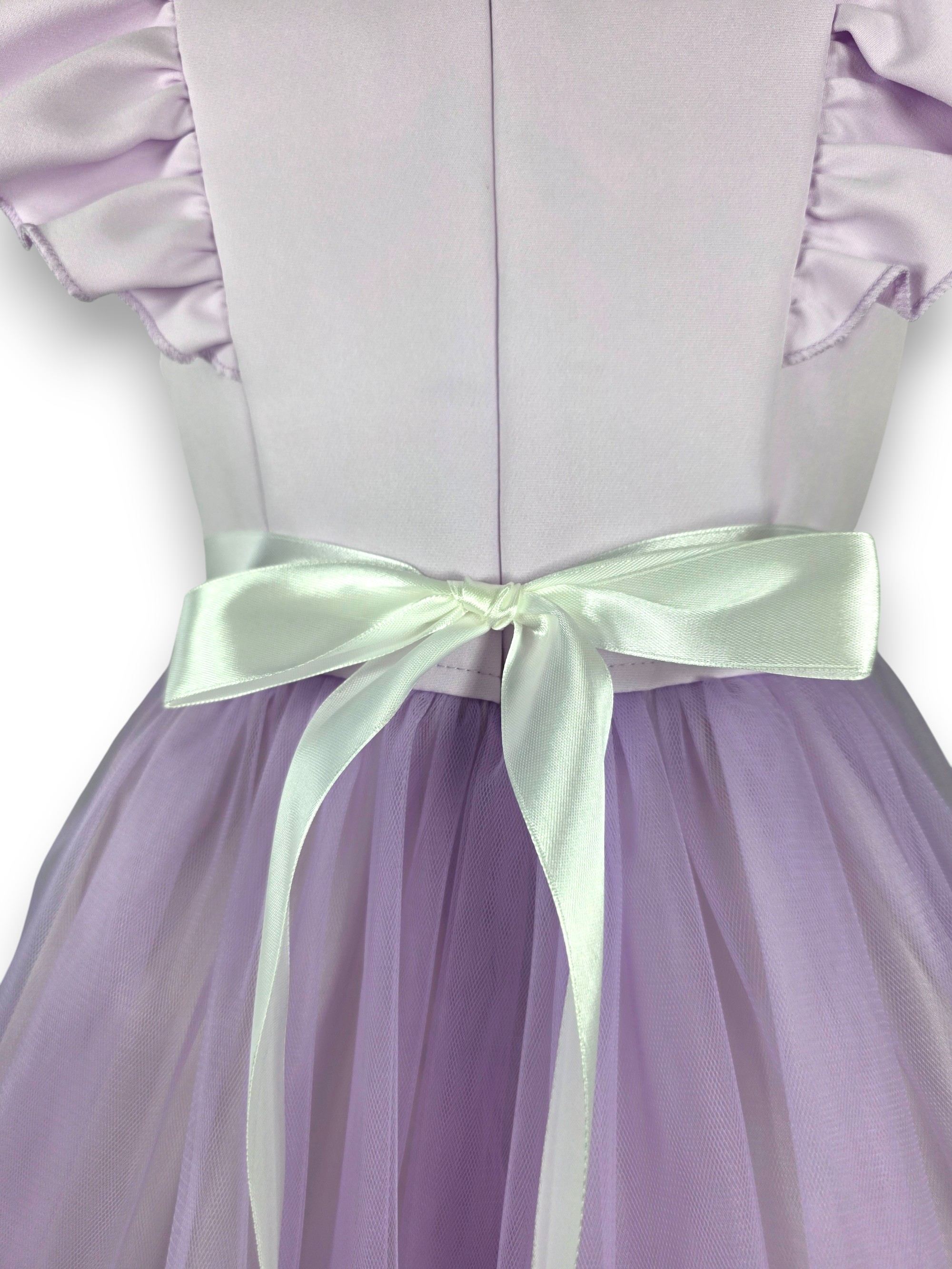 🎀 Idealne Dopasowanie: Z tyłu sukienki znajduje się satynowa szarfa, którą wiąże się w efektowną kokardę. Pozwala to idealnie dopasować szerokość sukienki do talii dziewczynki.